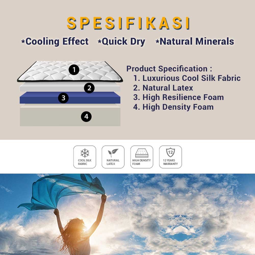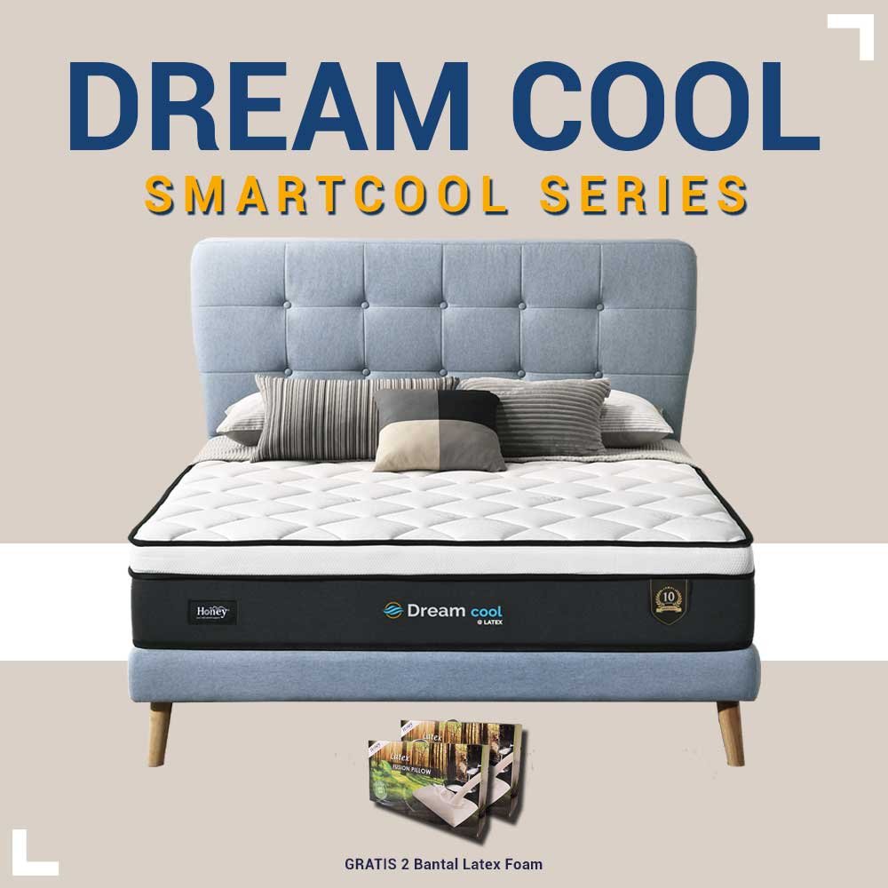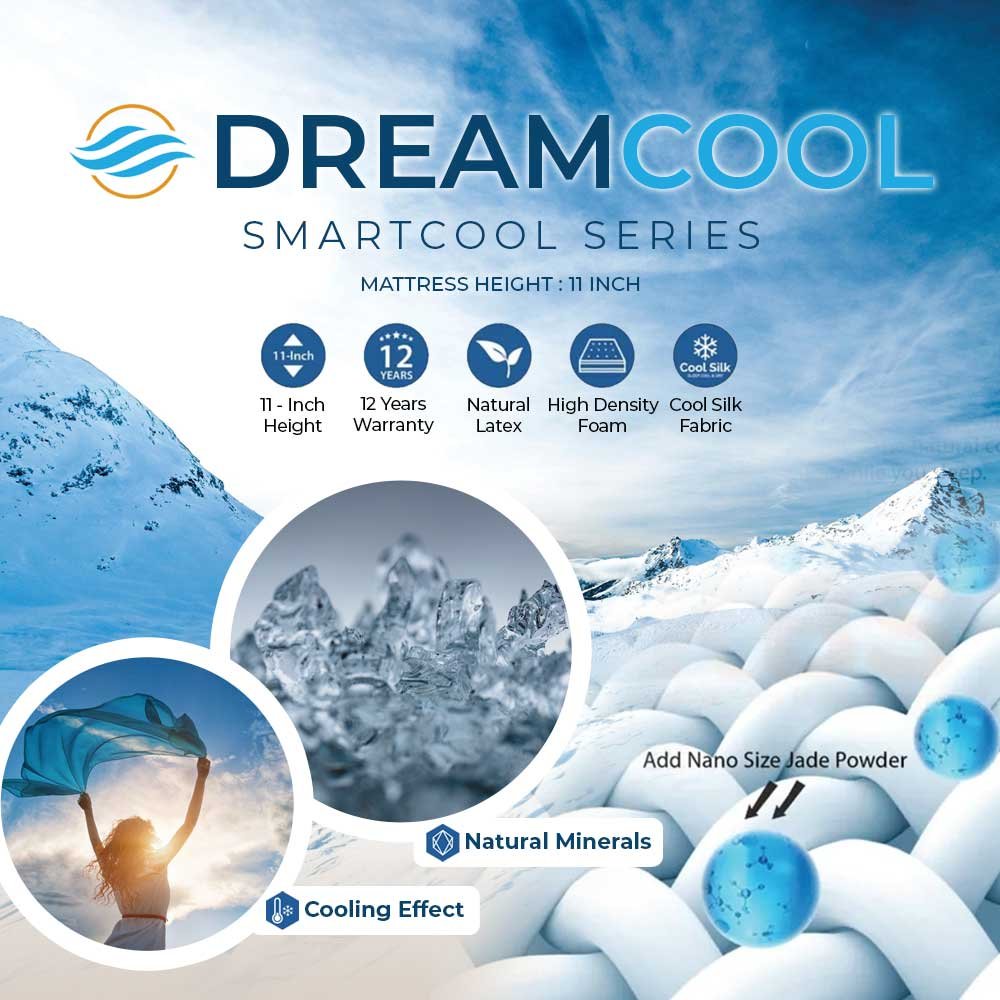 Dream Cool ini mengandung busa kepadatan tinggi pada Lapisan Bawah dan Lapisan latex pada bagian atas untuk memberikan rasa nyaman guna mengurangi tekanan. Kasur ini dilengkapi dengan lapisan sutra dingin untuk permukaan tidur yang lebih lembut dan sejuk. Kain Cool Silk memberikan sensasi lembut nan mewah, menyerap panas tubuh yang berlebih sehingga memberikan kesejukan yang luar biasa.