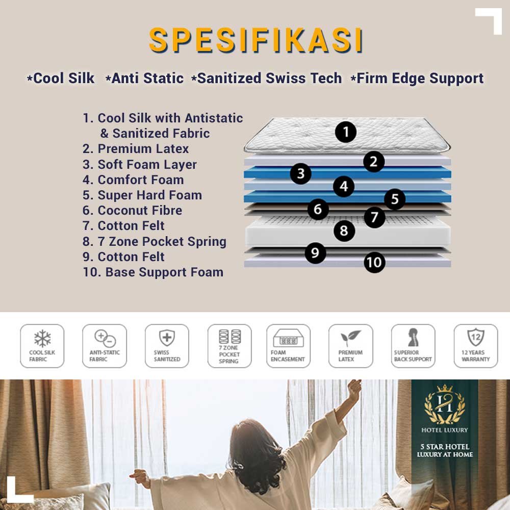 Dibuat dengan lateks premium untuk sirkulasi udara dan bantalan adaptif, serta dibalut Kain Teknologi Cool Silk untuk memberikan sirkulasi udara & ventilasi maksimal agar tidur Anda terasa sejuk, nyaman, dan nyenyak. Fungsi anti-statisnya menetralkan energi statis, mendorong relaksasi yang lebih mendalam. Kainnya yang lembut dan halus dipadukan dengan perawatan antimikroba Sanitized®, menjaga kain tetap higienis dan bebas dari bau jamur.